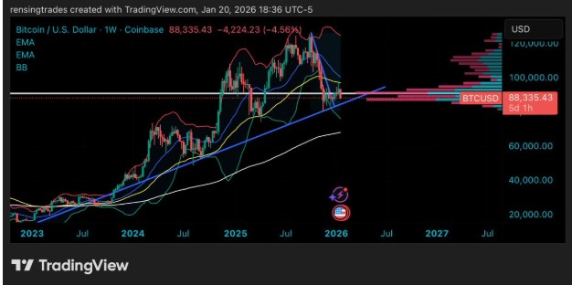 O Bitcoin fechou várias sessões acima de uma linha de tendência de longa data que se iniciou em 2023, demonstrando suporte contínuo nesses níveis. De acordo com o analista de mercado Rensing, o BTC chegou perto de US$ 88.335 em 20 de janeiro, antes de se recuperar modestamente para US$ 89.735 no dia seguinte. Essa movimentação ocorreu após uma recente queda semanal de 4,6% e deixou o BTC cerca de 29% abaixo de sua máxima de outubro de 2025, de US$ 126.198.