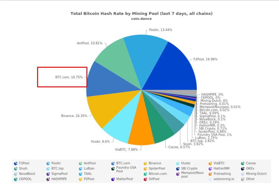A BTC.com (Bitdeer Technologies Company) foi fundada em 2016 e possui serviços de mineração de diversas criptomoedas, entre elas: Bitcoin, Bitcoin Cash, Ethereum e Litecoin. A empresa sozinha é responsável por 10% do total da rede.