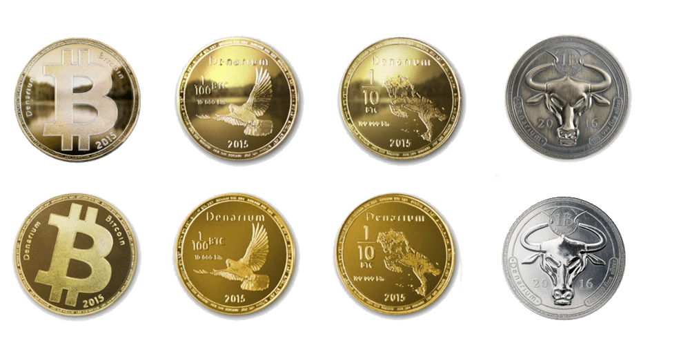 As moedas Denarium surgiram em 2015 e são cunhadas pela empresa finlendêsa Prasos, seus produtos parecem bastante com as casascius, contendo um lado maciço de diferentes materiais e um holograma no verso, bem como uma barra de ouro. Uma das diferenças é a opção de comprar as moedas com ou sem o saldo de BTC.