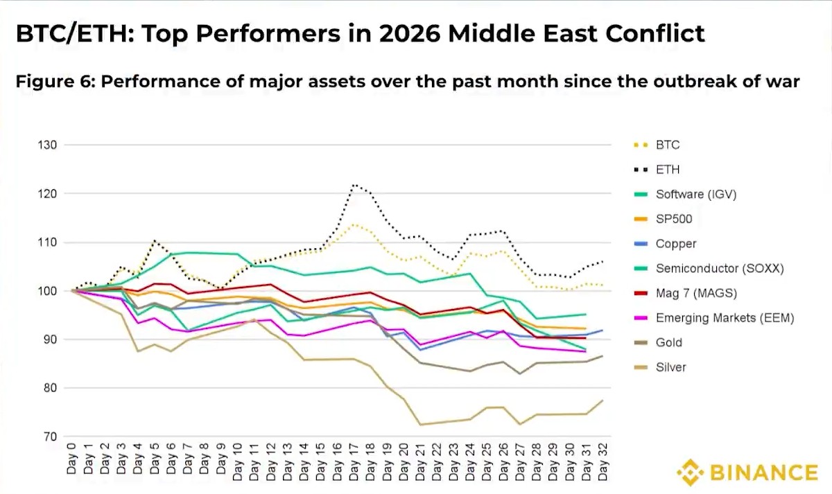 Citando um gráfico feito pela Binance Research, o investidor mostra que Bitcoin e Ethereum subiram 1% e 6%, respectivamente, desde o começo dos conflitos, há 32 dias.