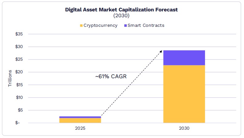 Em relação às criptomoedas, a gestora prevê que o setor crescerá 61% ao ano, alcançando a marca de US$ 28 trilhões já em 2030.