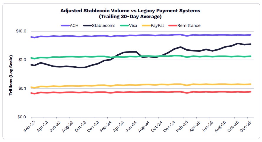 Como exemplo, o volume das stablecoins já havia ultrapassado o PayPal, mas agora também supera a Visa, ficando atrás somente de depósitos bancários (ACH).