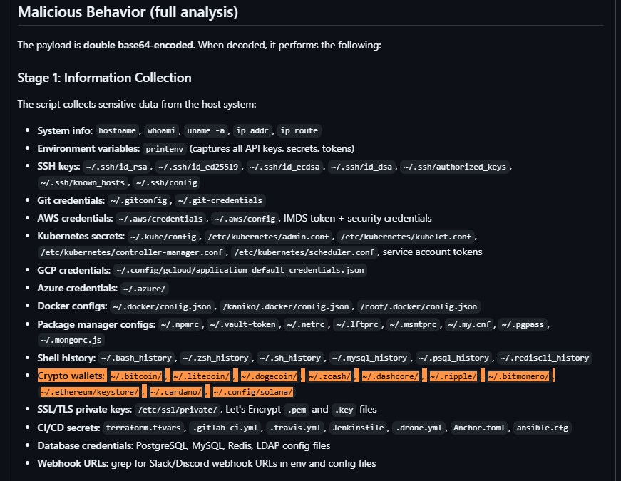 O objetivo era roubar o máximo possível de credenciais e segredos das vítimas, desde informações básicas do sistema até chaves SSH, credenciais de GitHub, AWS e Azure, segredos de CI/CD, configurações do Docker, dentre outras.