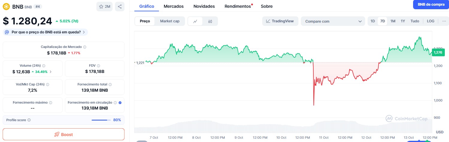 Enquanto o Bitcoin é negociado por US$ 114.700 no momento desta redação, recuperando parte de suas perdas do crash da última sexta-feira (10), a BNB apresenta uma recuperação ainda mais forte.