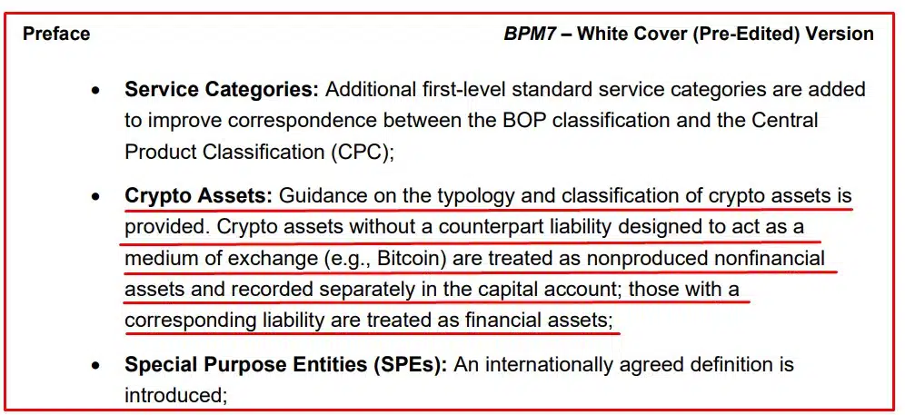 “Criptoativos: são fornecidas orientações sobre a tipologia e a classificação de criptoativos. Criptoativos sem passivo correspondente, projetados para funcionar como meio de troca (por exemplo, Bitcoin), são tratados como ativos não financeiros não produzidos e registrados separadamente na conta de capital; aqueles que têm um passivo correspondente são tratados como ativos financeiros”, sugere o FMI no Manual Integrado de Balanço de Pagamentos e Posição de Investimento Internacional (BPM7).