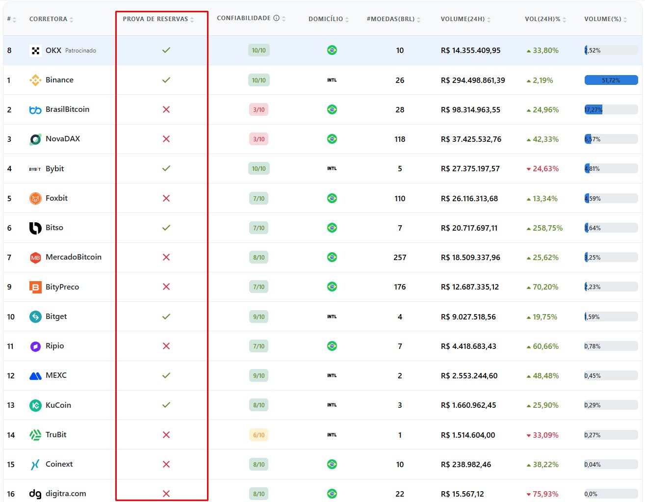 No entanto, dados do MercadoCripto revelam que nem todas adotaram este padrão. Das dez maiores corretoras por volume que operam no Brasil, metade não divulga suas reservas.