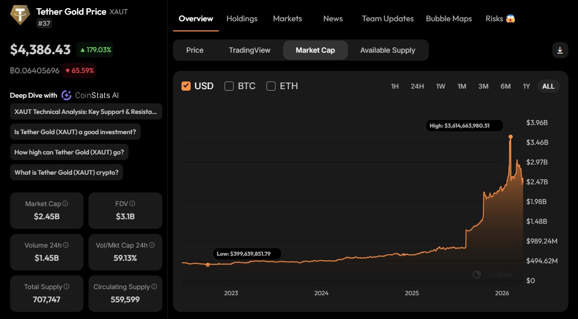 Dados do CoinStats apontam que o XAUT é a 33ª maior criptomoeda do mundo, estando com um valor de mercado de US$ 2,45 bilhões no momento desta redação.