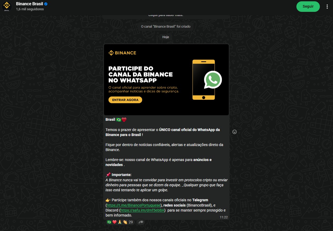 “Temos o prazer de apresentar o ÚNICO canal oficial do WhatsApp da Binance para o Brasil! Fique por dentro de notícias confiáveis, alertas e atualizações direto da Binance.”