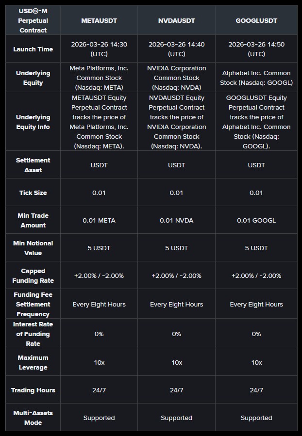 A Binance, maior corretora de criptomoedas do mundo, anunciou nesta terça-feira (24) que estará adicionando a negociação de contratos perpétuos de ações da Meta, Nvidia e Google em sua plataforma.