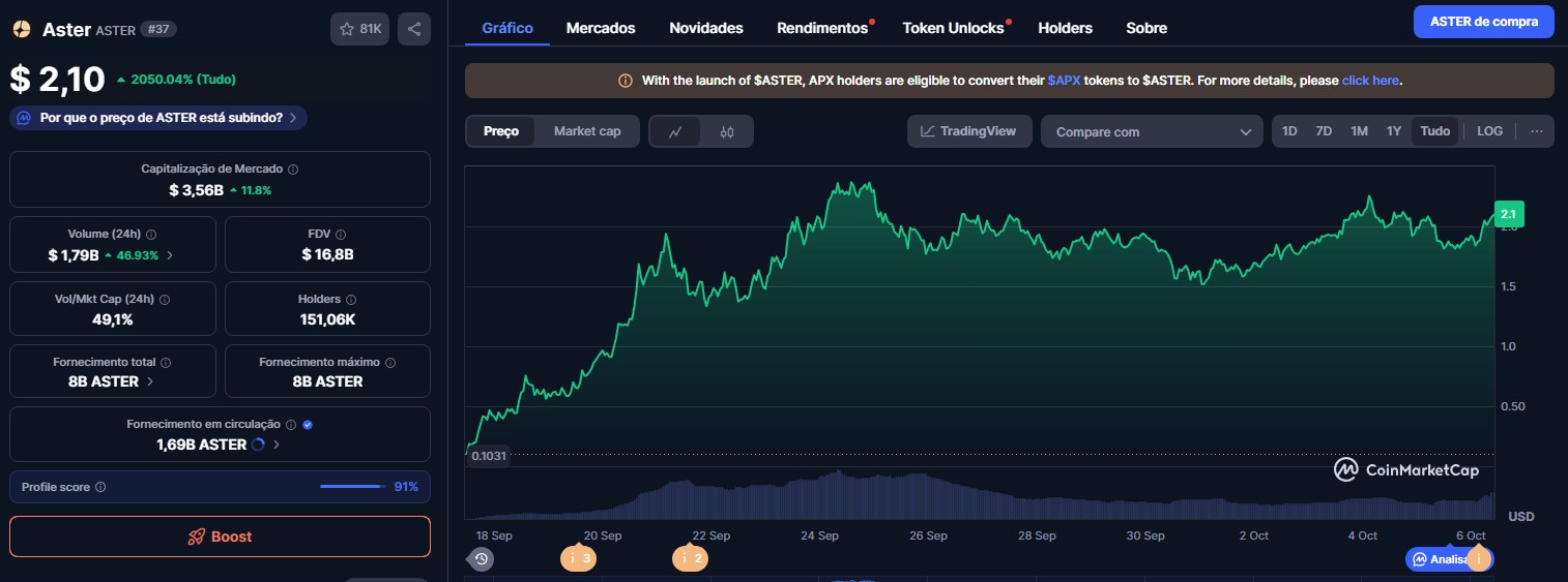 Outro destaque é o preço do token ASTER. Desde seu lançamento, há cerca de 19 dias, a criptomoeda passou por uma valorização superior a 2.000%.