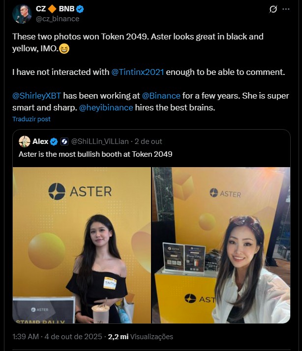 “Essas duas fotos venceram o Token 2049. A Aster ficou ótima de preto e amarelo, na minha opinião.”