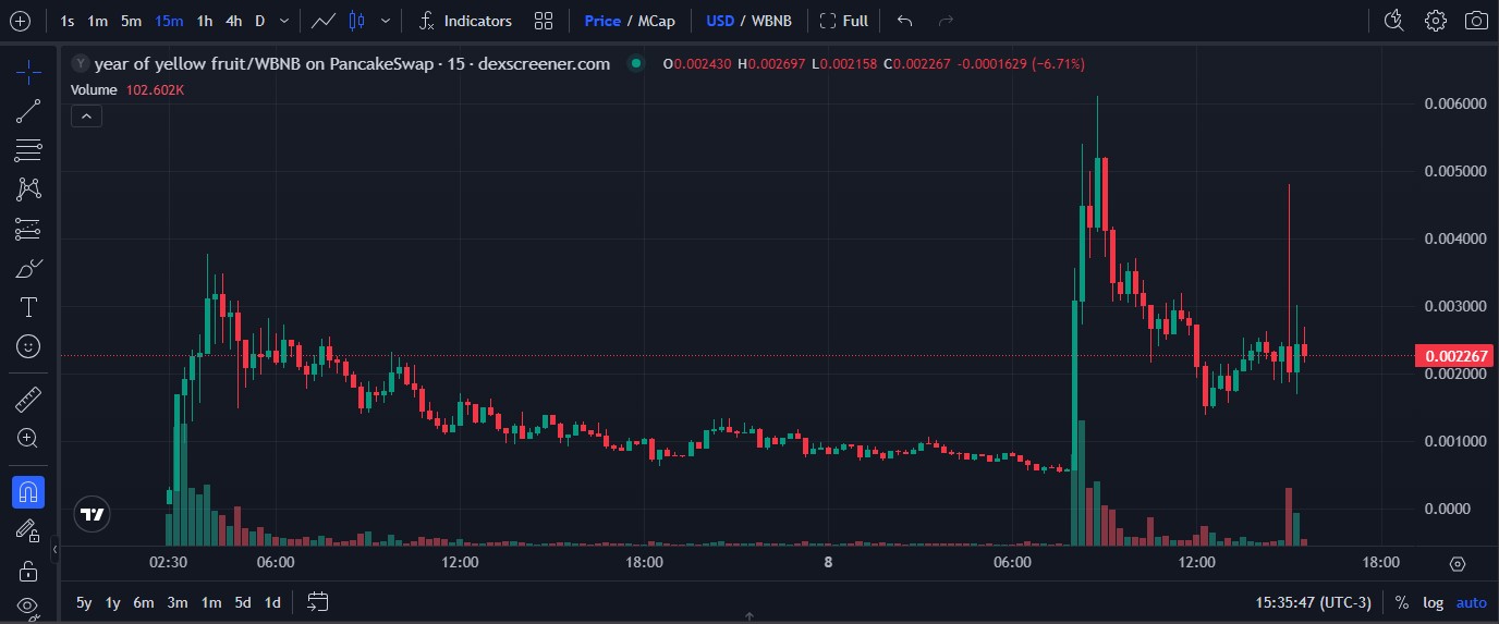 Dados de corretoras descentralizadas mostram que a criptomoeda “year of yellow fruit” subiu 4.600% em pouco mais de uma hora. Após cair 85% no dia seguinte, a moeda curiosamente valorizou 980%, justamente após o anúncio de punição da Binance.