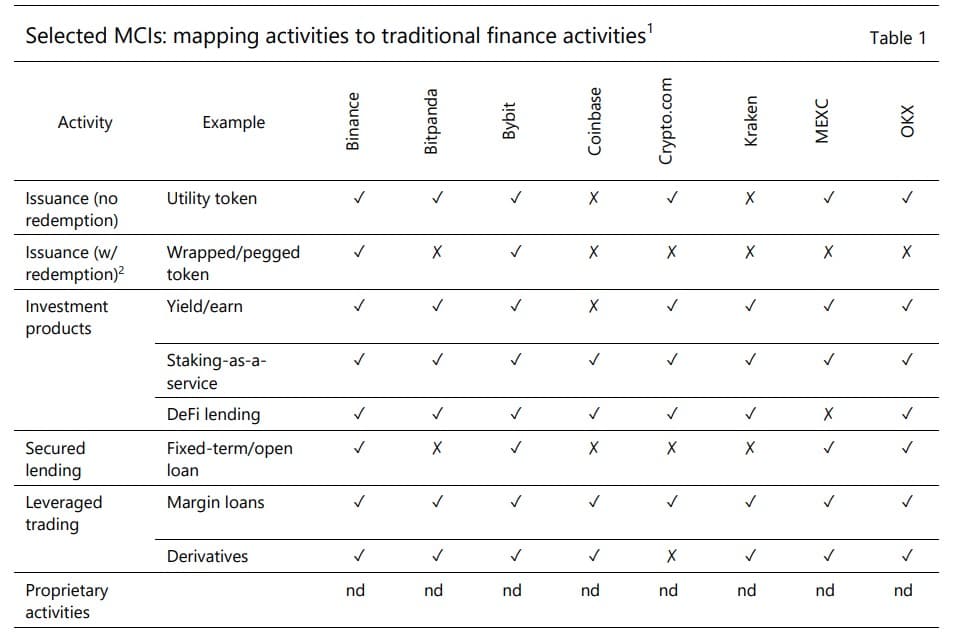 “A maioria dos grandes MCIs também oferece serviços de carteira digital e custódia, além de staking, empréstimos, negociação à vista e de derivativos, produtos colateralizados (como empréstimos lastreados em criptoativos) e outros serviços de corretagem prime”, explica o estudo.