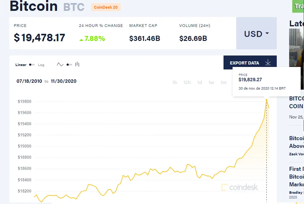 Com um consenso de que o maior valor do bitcoin foi de $ 19,600 na maioria das corretoras, o preço foi superado hoje, quando o valor atingiu pico de $ 19.829,27 e depois teve uma leve correção