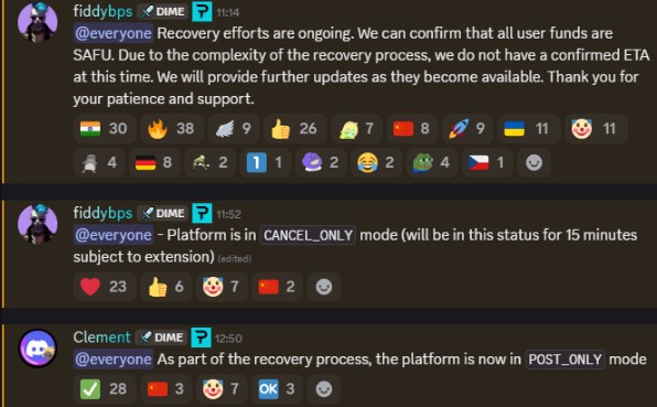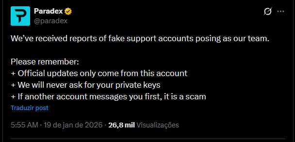 As atualizações sobre a falha na corretora descentralizada Paradex foram publicadas em seu Discord oficial. Cerca de uma hora após iniciarem as investigações, os desenvolvedores surgiram com uma solução.