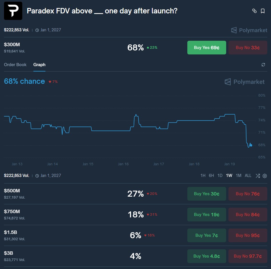 Na Polymarket, apostadores também diminuíram suas previsões sobre o valor do token da Paradex quando for lançado.