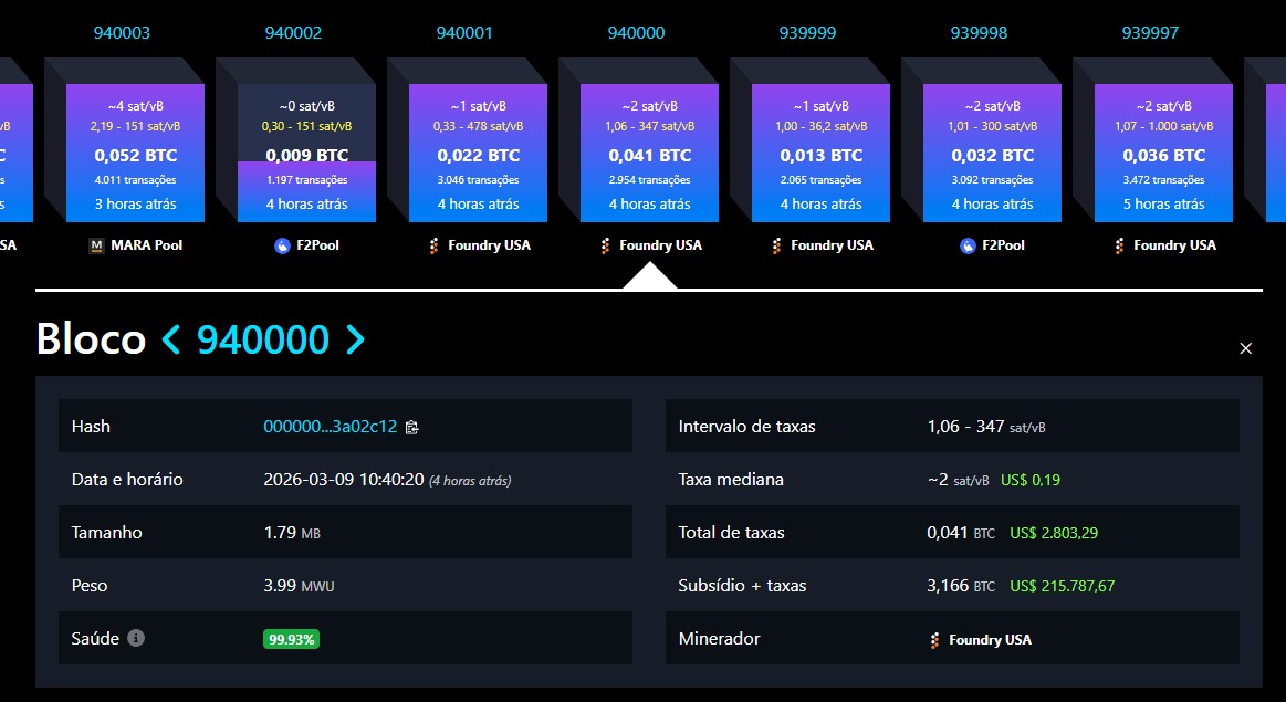 O evento ocorreu no bloco #940.000, minerado pela Foundry USA às 10h40 na manhã desta segunda-feira (9).