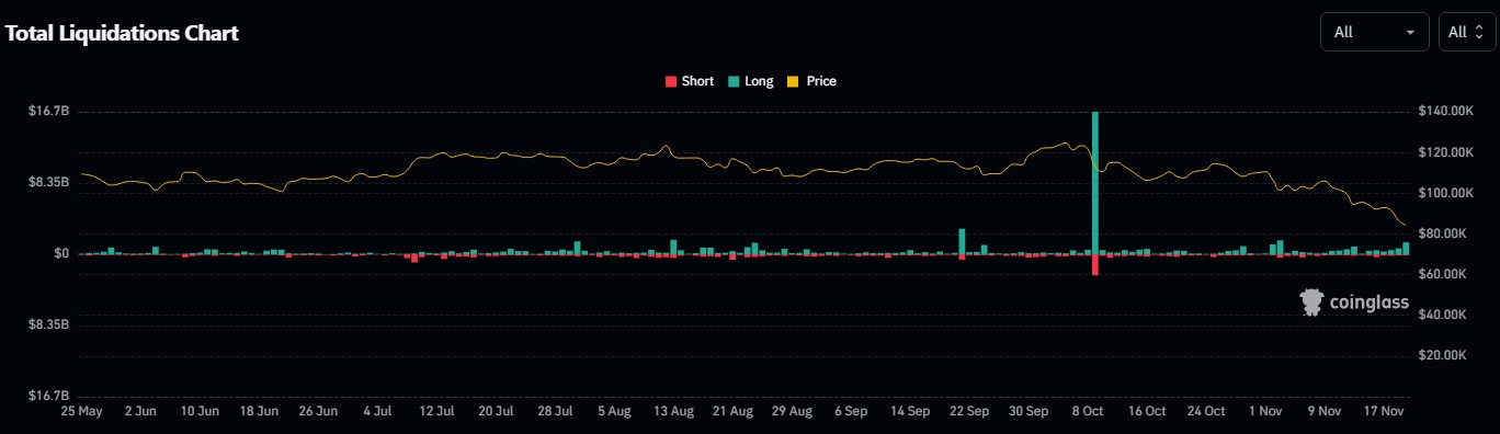 Embora o Bitcoin tenha perdido o suporte dos US$ 100.000 e depois dos US$ 90.000, caindo abruptamente nos últimos dias, poucos traders estão sendo liquidados no mercado de futuros.