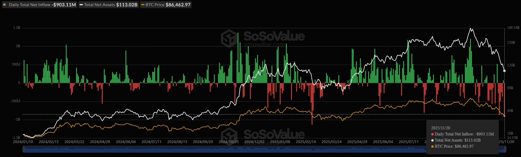 Dados do SoSoValue mostram saídas de US$ 903 milhões. Esse é o segundo pior dia da história dos ETFs, superando os US$ 870 milhões da sexta-feira (14) da semana anterior.