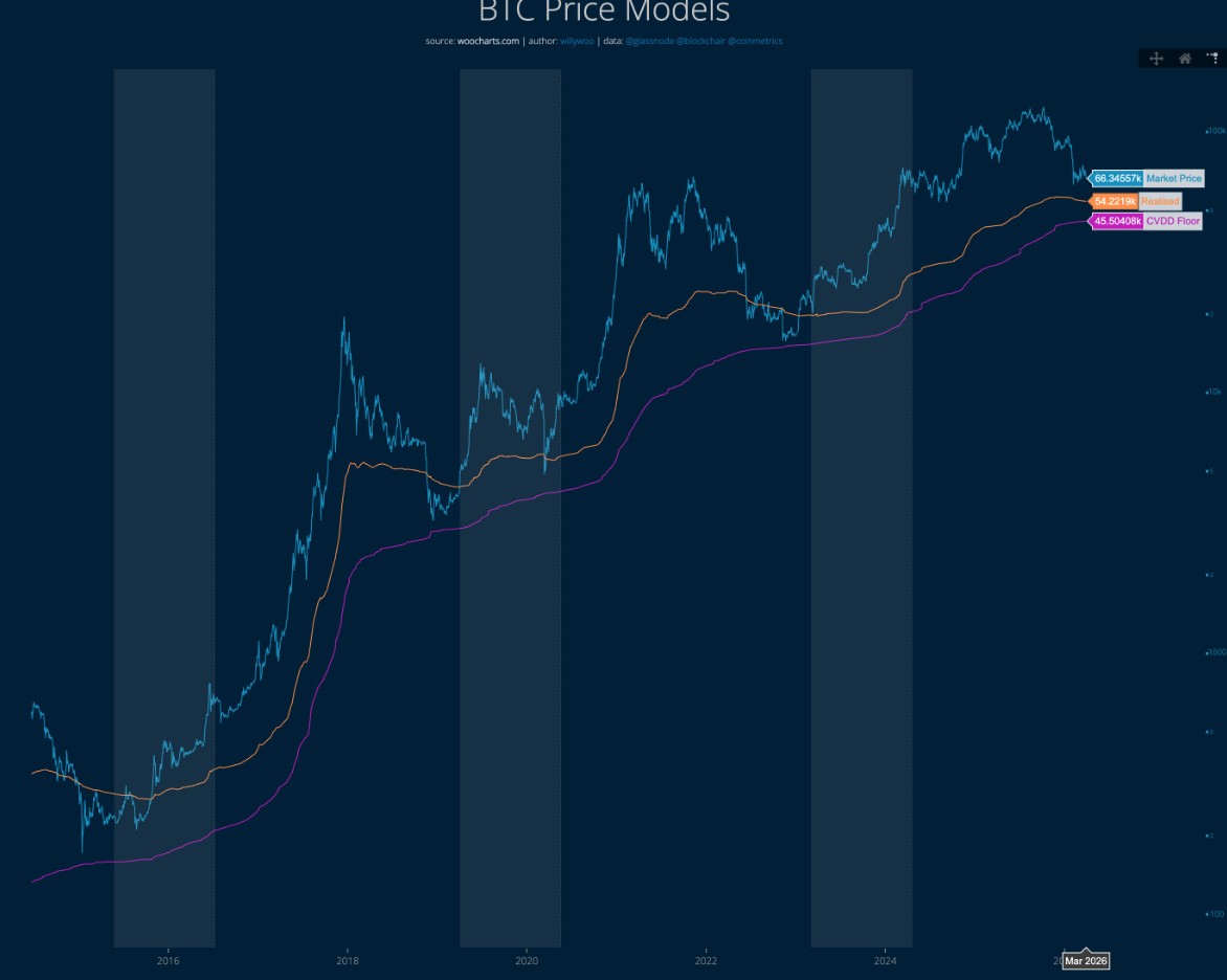 Usando um modelo que analisa o Preço Realizado (Realized Price) e outro sobre o Piso de Dias de Moeda Destruídos Cumulativos (CVDD Floor), Woo diz ser possível até ter uma noção de quanto isso acontecerá.