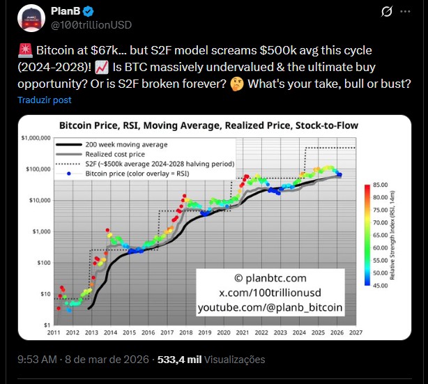 PlanB, criador do modelo Stock-to-Flow (S2F), acredita que o Bitcoin deveria chegar a US$ 500.000 neste ciclo. Caso contrário, afirma que seu modelo pode estar quebrado.