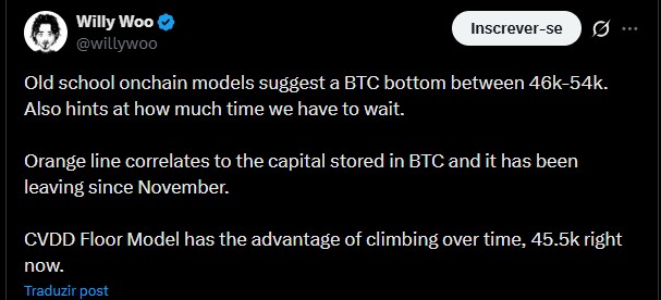 “A linha laranja correlaciona-se ao capital armazenado no BTC, que vem saindo desde novembro”, explicou o trader. “O modelo CVDD Floor tem a vantagem de subir com o tempo, estando em US$ 45.500 no momento.”