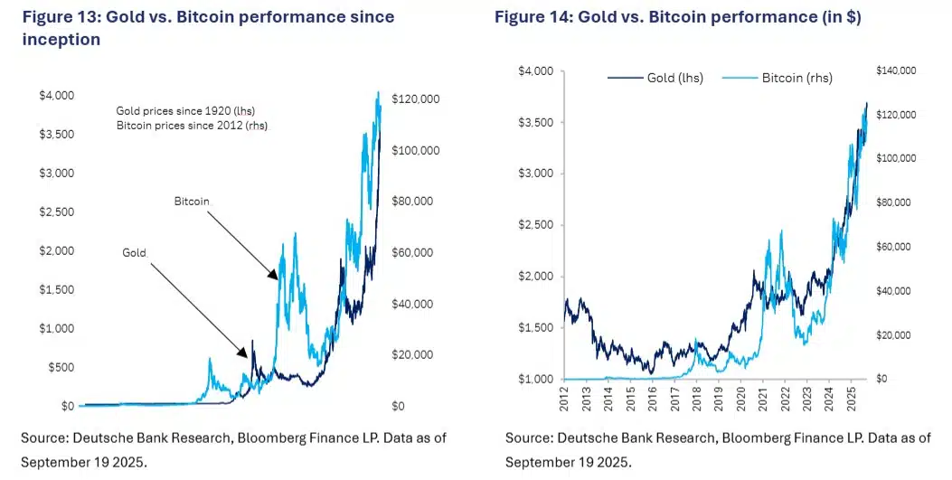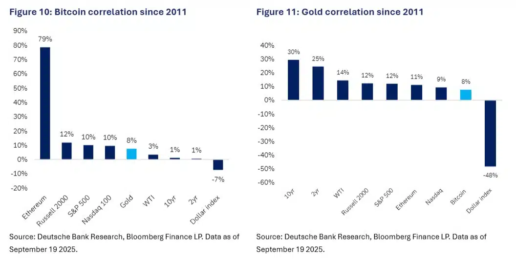 “Como já enfatizamos, Bitcoin e ouro são considerados alternativas complementares às reservas tradicionais de refúgio seguro devido a sua (i) baixa correlação com outras classes de ativos, (ii) oferta relativamente escassa e (iii) uso como proteção contra a inflação e a volatilidade geopolítica”, escreveu o Deutsche Bank.