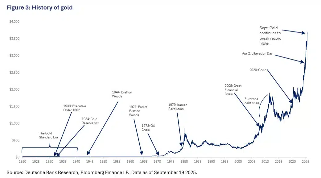 Como exemplo, o Deutsche Bank destaca que o metal passou por diversas valorizações ao longo de sua história devido a eventos como o fim do acordo de Bretton Woods em 1971, a bolha imobiliária de 2008 e, mais recentemente, o Dia da Libertação dos EUA em 2025.