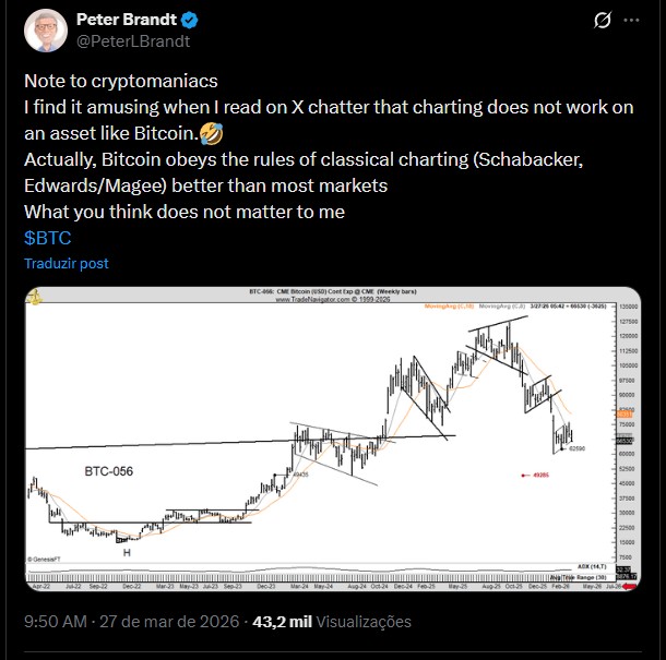 “Nota aos criptomaníacos. Acho divertido quando leio comentários no X dizendo que análise gráfica não funciona em um ativo como o Bitcoin.