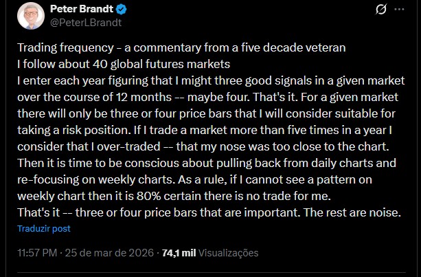 Peter Brandt começou a operar no mercado de futuros em 1975, há 51 anos. Além de publicar análises em suas redes sociais, o trader também posta reflexões mais pessoais sobre a sua profissão.