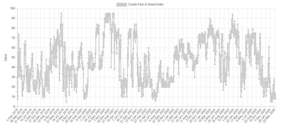 Além disso, o Índice de Medo e Ganância do Bitcoin segue em ‘medo extremo‘, sendo este um dos períodos mais longos nesta faixa.