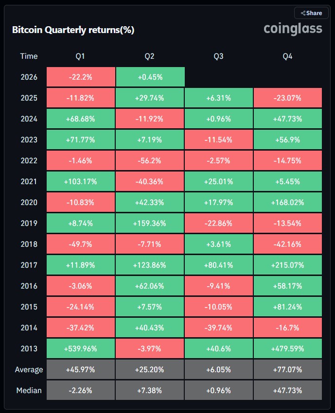 O Bitcoin (BTC) fechou o mês de março na faixa dos US$ 68.200, acumulando perdas de 22,2% no primeiro trimestre de 2026. No trimestre anterior, a criptomoeda já havia caído 23%.