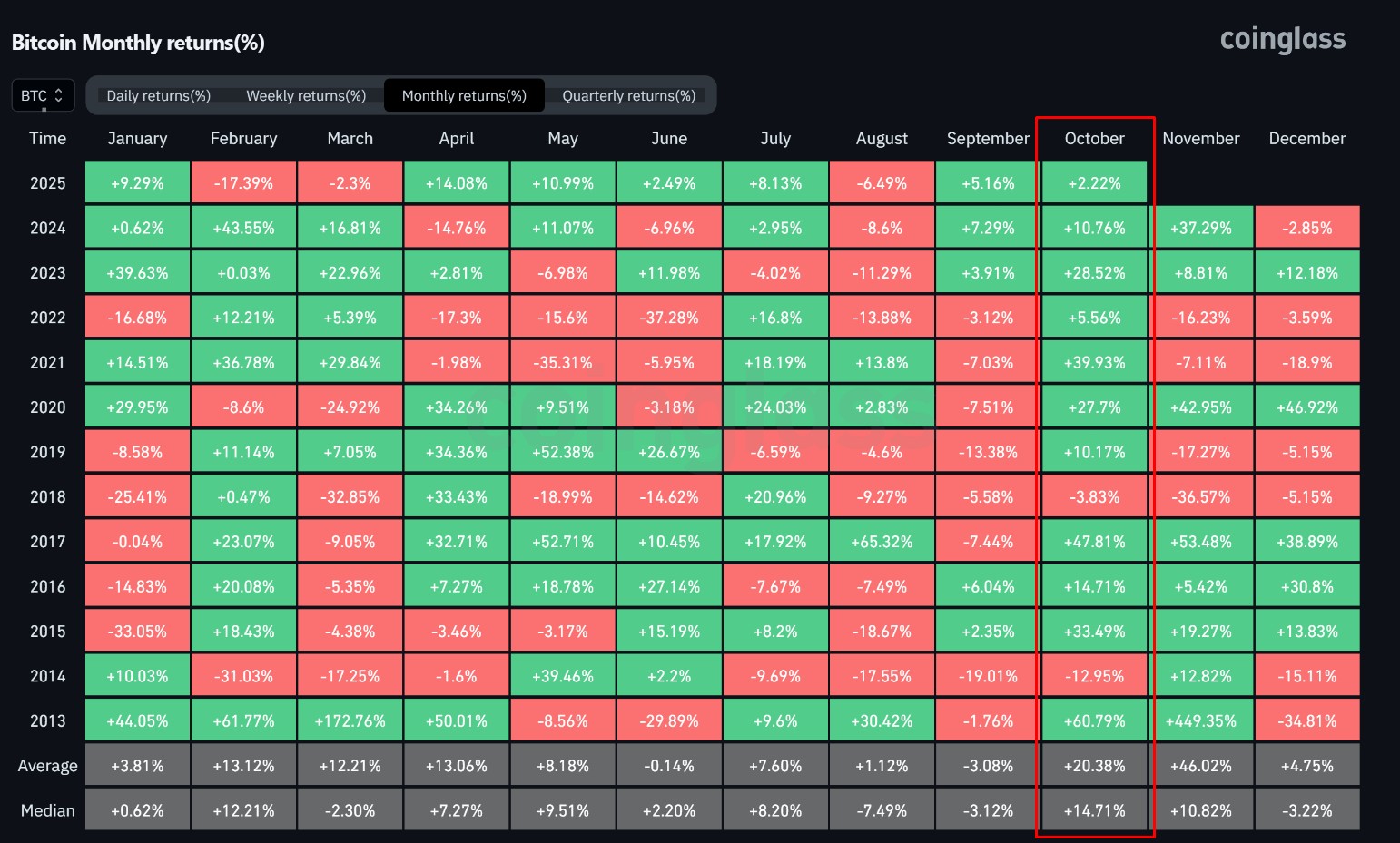 Dados históricos mostram que outubro é o melhor mês da história do Bitcoin. Além de ter fechado os últimos seis outubros consecutivos em alta, a criptomoeda também apresenta bons retornos médios no período analisado desde 2013.
