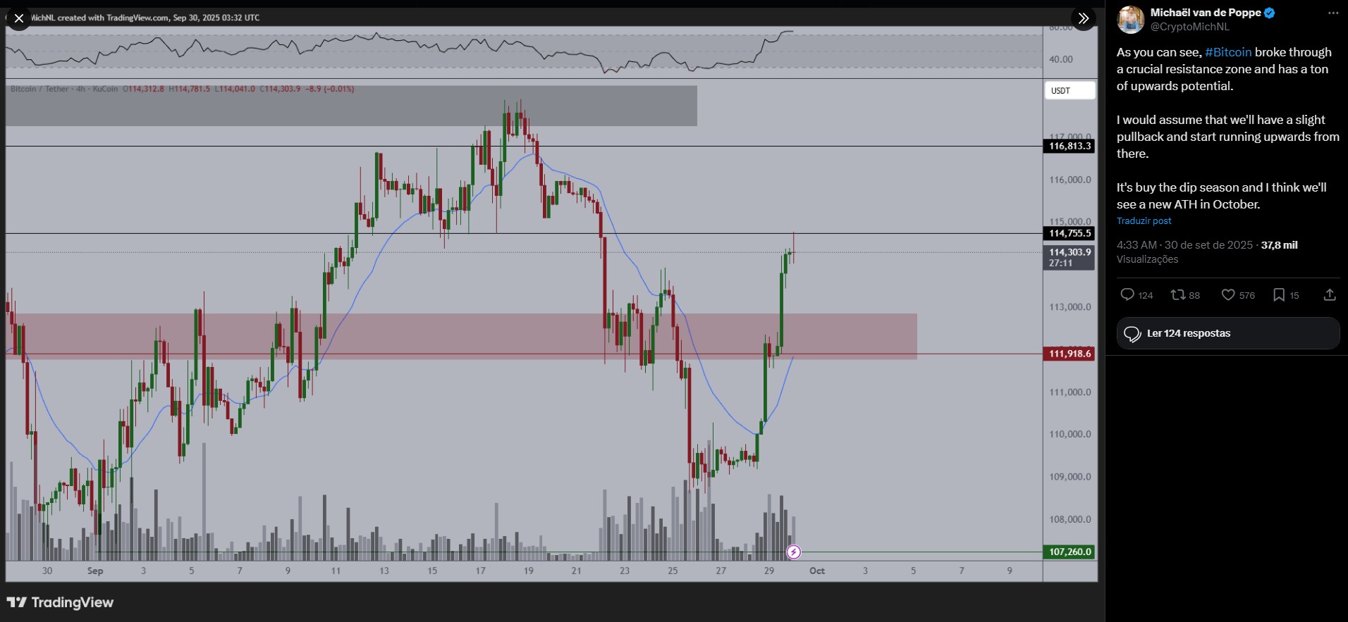 Famoso trader Michaël van de Poppe aponta que Bitcoin se recuperou bem da última queda e pode continuar subindo em outubro. Fonte: X.