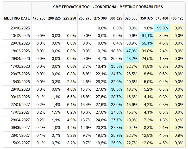 O principal evento que pode mexer com o preço do Bitcoin é a reunião do Fed, marcada para o dia 31 de outubro. Segundo a Ferramenta CME FedWatch, hoje as chances estão em 99% para um corte de 0,25% e em 1% para um corte de 0,5%.