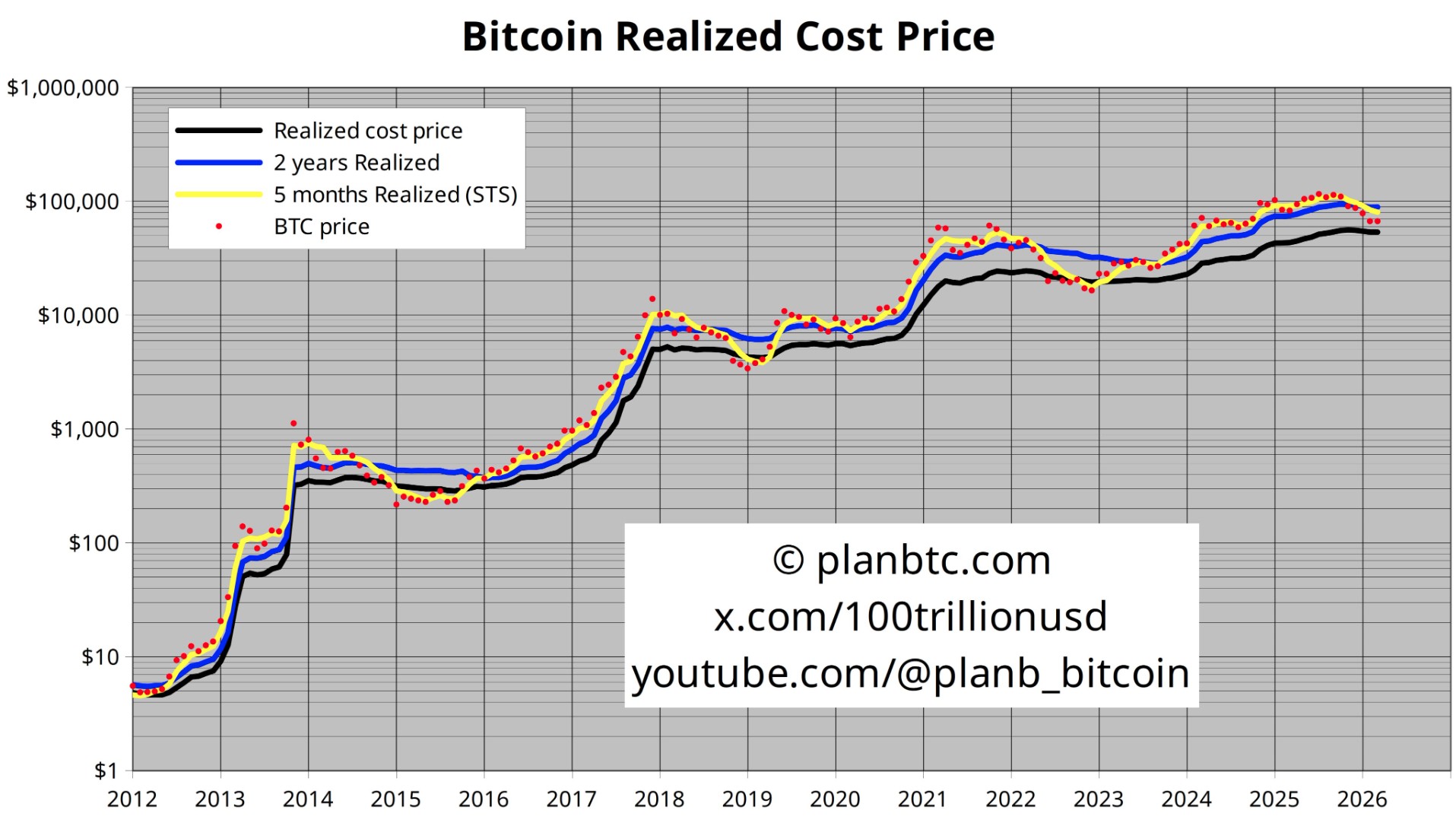 “Bitcoin a 67 mil… agora ABAIXO do realizado de 2 anos (89 mil, em azul) E do realizado de 5 meses (80 mil, em amarelo)!”, iniciou PlanB.
