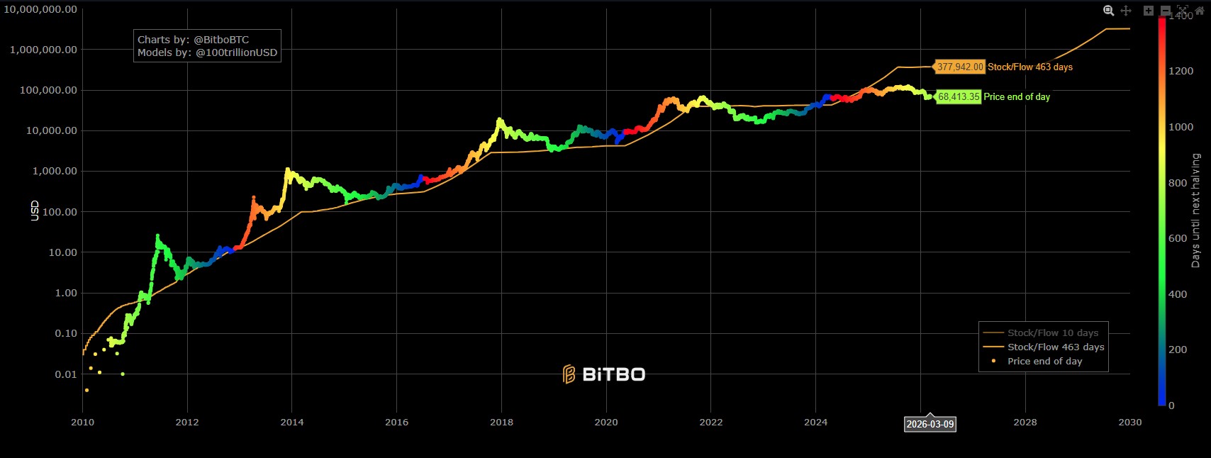 Segundo a ferramenta, hoje o preço do Bitcoin deveria estar na casa dos US$ 378 mil, cerca de 5,5 vezes acima do valor atual.
