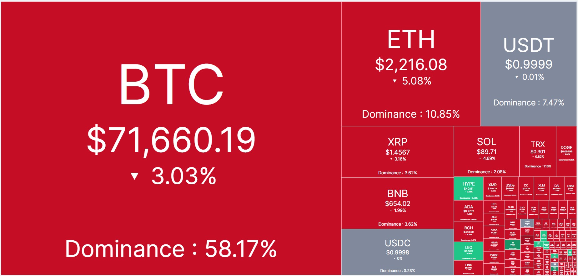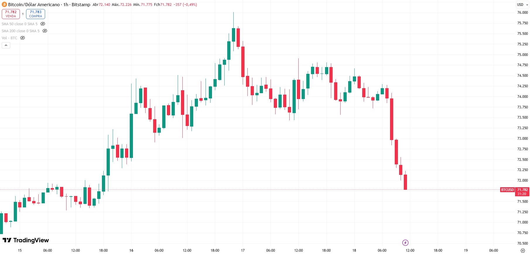 O Bitcoin opera abaixo dos US$ 72.000 na manhã desta quarta-feira (18), dia de reunião do Fed, recuando 5,4% em relação aos US$ 76.000 registrados na segunda-feira (16).