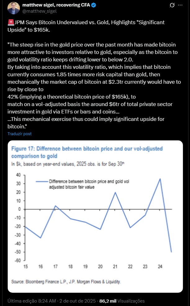 “Considerando essa razão de volatilidade, que indica que o Bitcoin atualmente consome 1,85 vez mais capital de risco que o ouro, então, mecanicamente, a capitalização de mercado do Bitcoin de US$ 2,3 trilhões atualmente precisaria subir cerca de 42% (implicando um preço teórico do Bitcoin de US$ 165 mil), para igualar, em base ajustada pela volatilidade, os cerca de US$ 6 trilhões de investimento total do setor privado em ouro via ETFs, barras e moedas”, escreveu o JP Morgan.