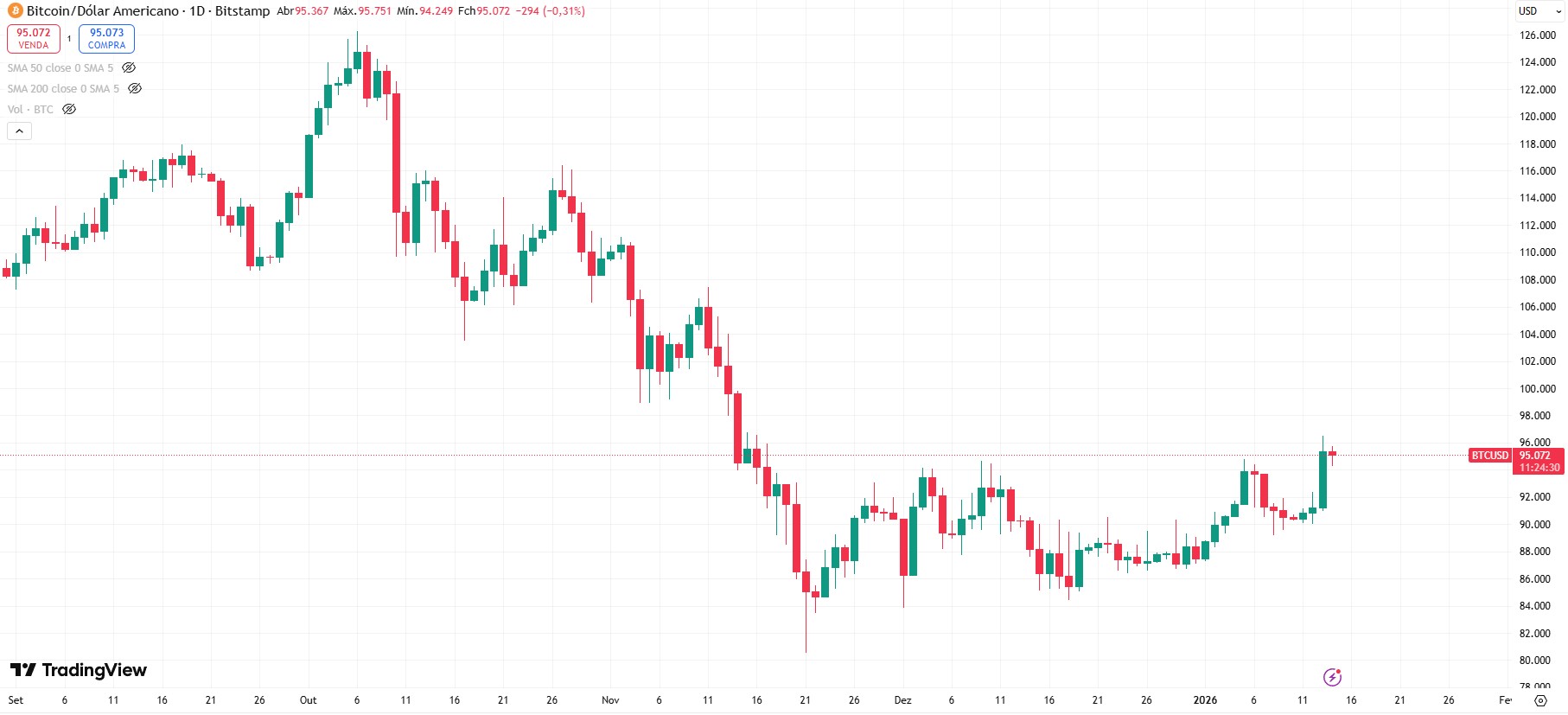 Nesta terça-feira (13), a criptomoeda chegou a US$ 96.474, seu maior preço desde novembro, há dois meses.