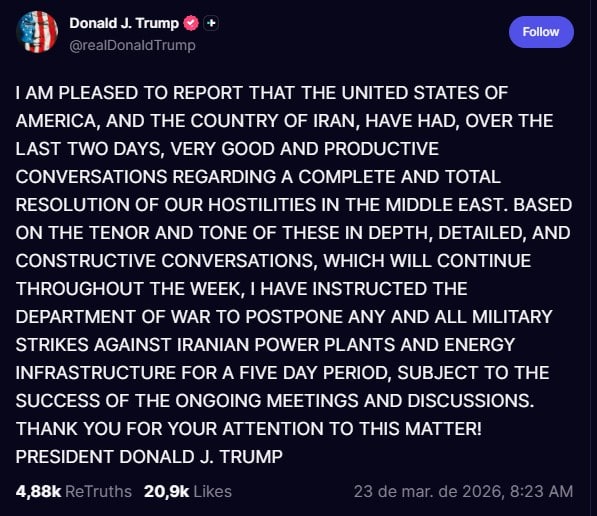 Nas suas redes sociais, Trump afirmou que os dois países tiveram diálogos produtivos nos últimos dois dias. Indo além, também prometeu adiar ataques contra usinas de energia e a infraestrutura energética iraniana.