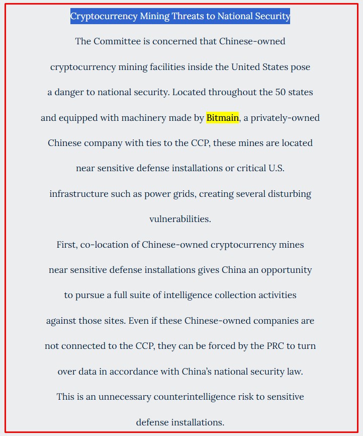 “O Comitê está preocupado com o fato de que instalações de mineração de criptomoedas de propriedade chinesa dentro dos Estados Unidos representem um perigo para a segurança nacional”, aponta o governo americano. “Localizadas em todos os 50 estados e equipadas com máquinas fabricadas pela Bitmain, uma empresa privada chinesa com ligações ao PCC (Partido Comunista Chinês), essas operações estão situadas próximas a instalações de defesa sensíveis ou a infraestrutura crítica dos EUA, como redes elétricas, criando vulnerabilidades perturbadoras.”