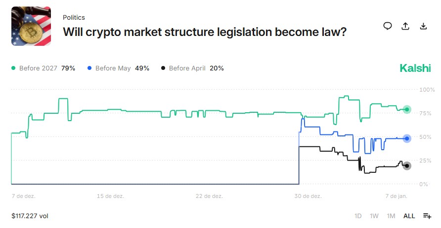 “A Kalshi estima as chances em 46% até maio e 82% até o fim do ano.”