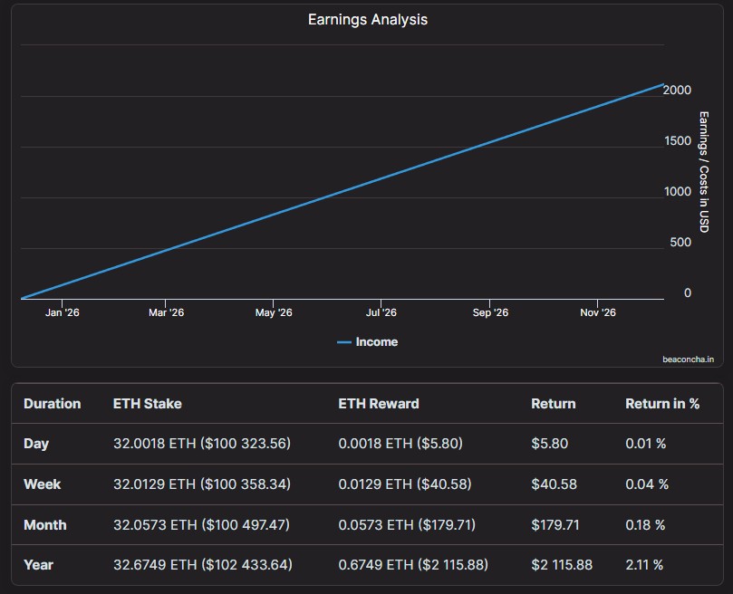 Segundo exploradores de blocos, hoje o staking de Ethereum está pagando cerca de 2,11% ao ano (0,18% ao mês). Os ganhos estão ligados à produção de blocos na rede, servindo como uma recompensa similar à mineração.
