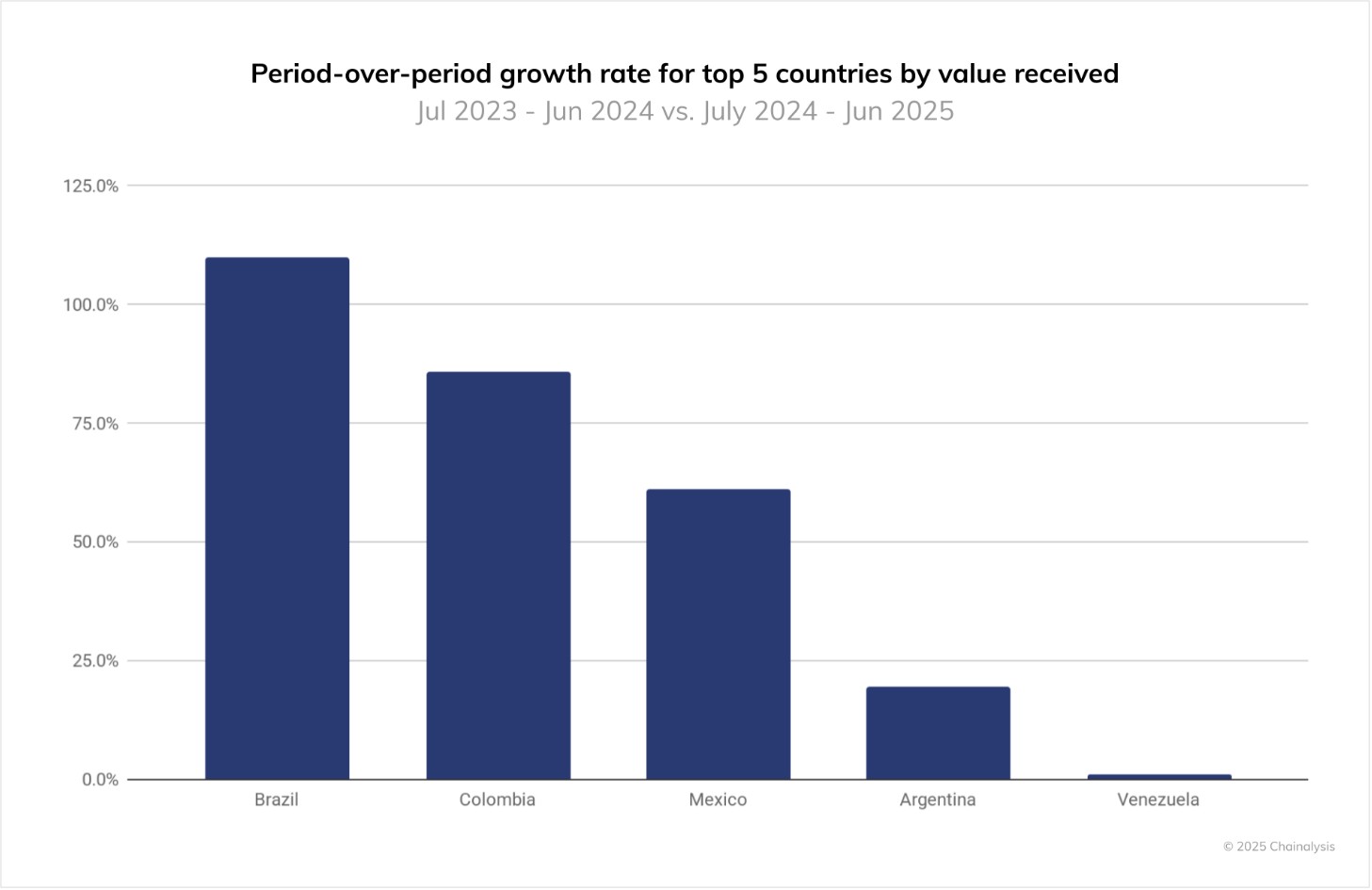 As menções ao Brasil pelo estudo da Chainalysis não param por aí. Na sequência, o relatório aponta que o país teve um crescimento de 109,9% em julho de 2024 a junho de 2025 em relação a julho de 2023 a junho de 2024.