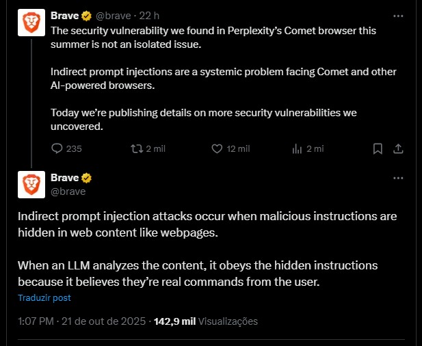 No entanto, no mesmo dia, o Brave Browser revelou um segundo estudo sobre vulnerabilidades nestes navegadores de IA. O foco não foi o Atlas, mas sim o Comet da Perplexity AI, e o Fellou.