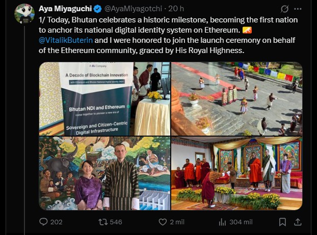 “Hoje, o Butão celebra um marco histórico, tornando-se a primeira nação a basear seu sistema nacional de identidade digital no Ethereum.”