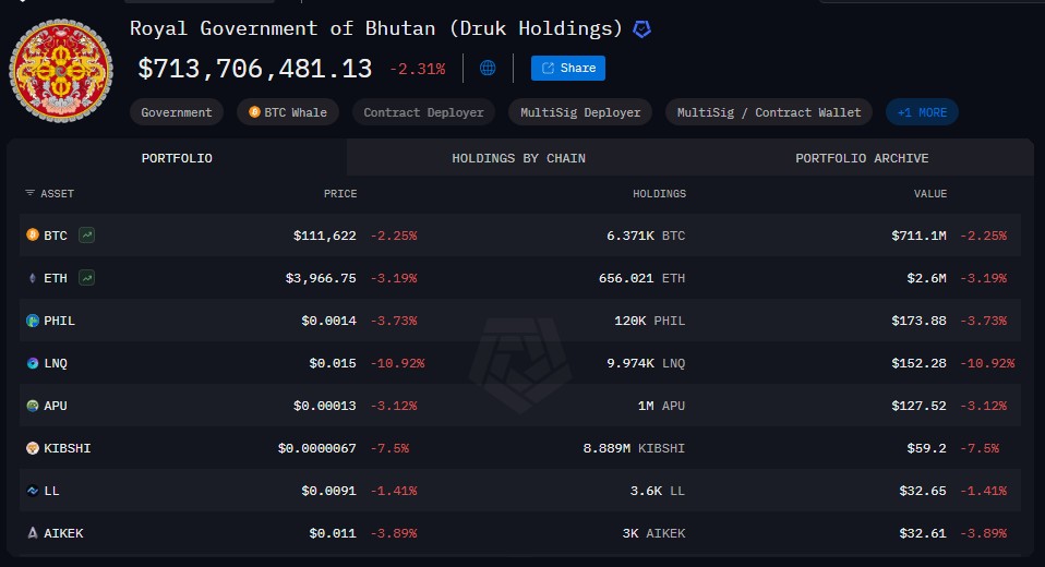 Segundo dados da Arkham, hoje o governo butanês possui 6.371 bitcoins, avaliados em US$ 711 milhões/R$ 3,9 bilhões, ficando atrás somente dos EUA (197.354 BTC) e Reino Unido (61.245 BTC).