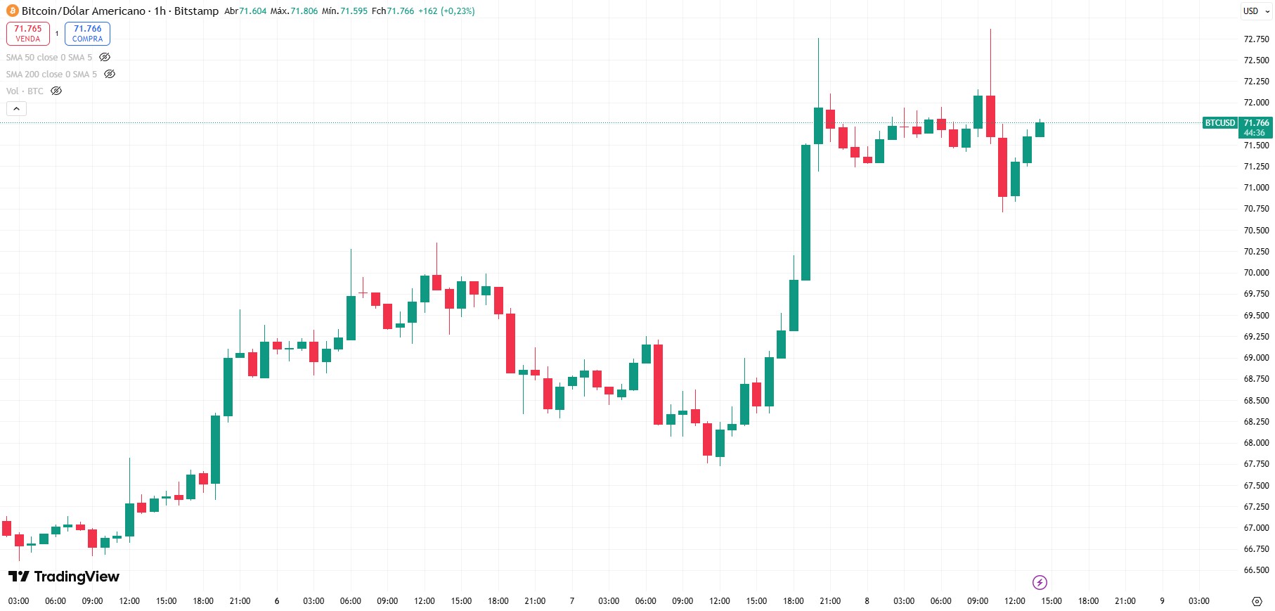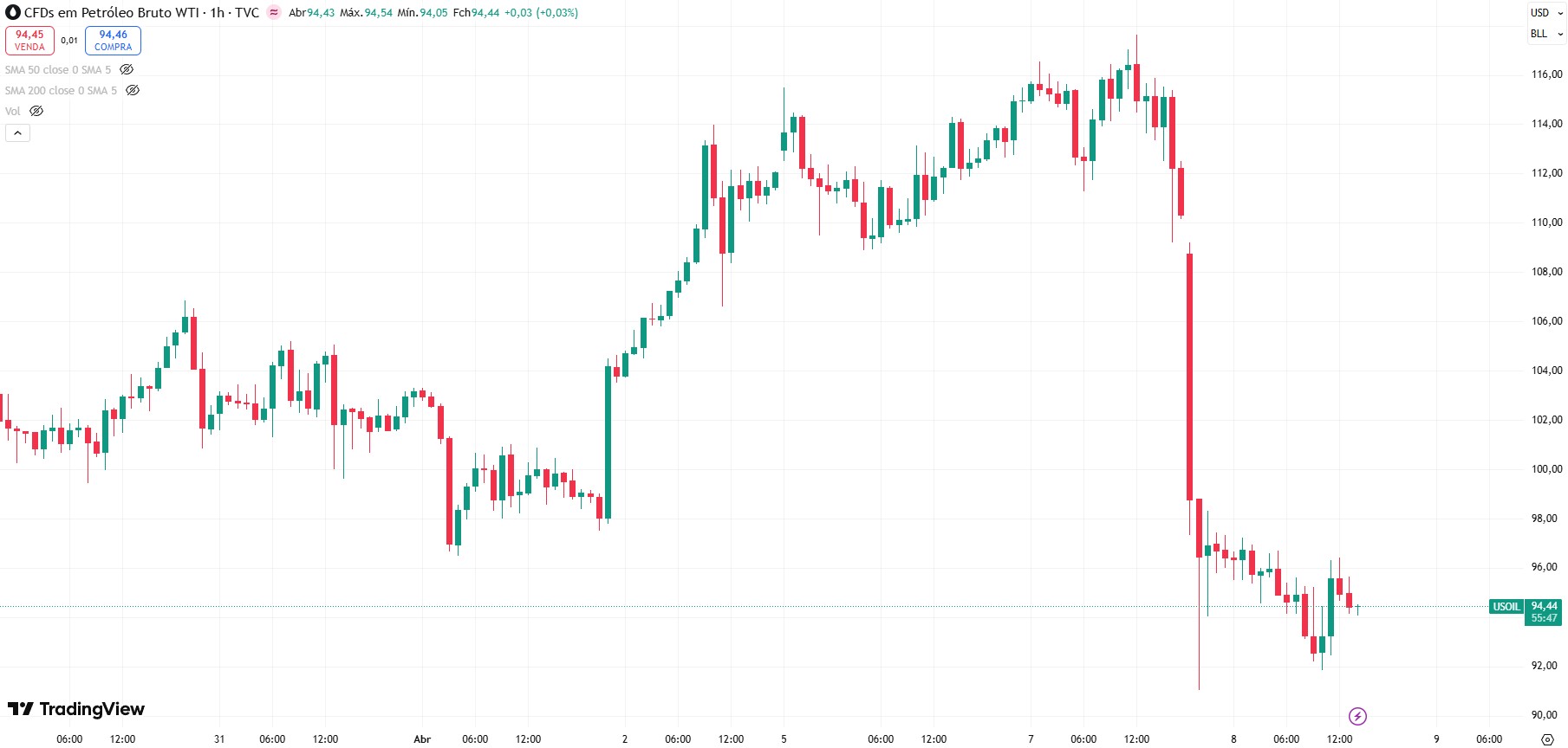 Por fim, enquanto o petróleo descia, o Bitcoin subia. A maior criptomoeda do mercado chegou a US$ 72.850 na manhã desta quarta-feira (8), refletindo a esperança do mercado de que os conflitos no Oriente Médio cheguem ao fim.
