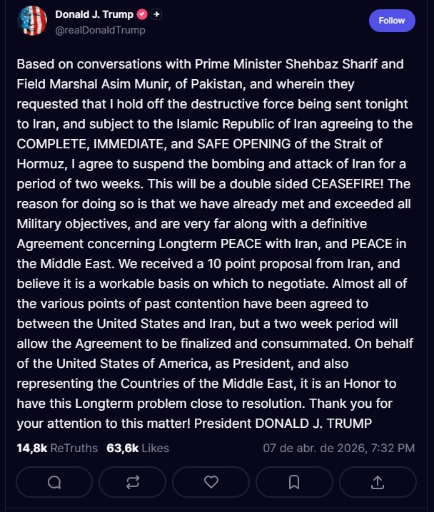 “Condicionada à concordância da República Islâmica do Irã com a ABERTURA COMPLETA, IMEDIATA E SEGURA do Estreito de Ormuz, concordo em suspender o bombardeio e o ataque ao Irã por um período de duas semanas.”